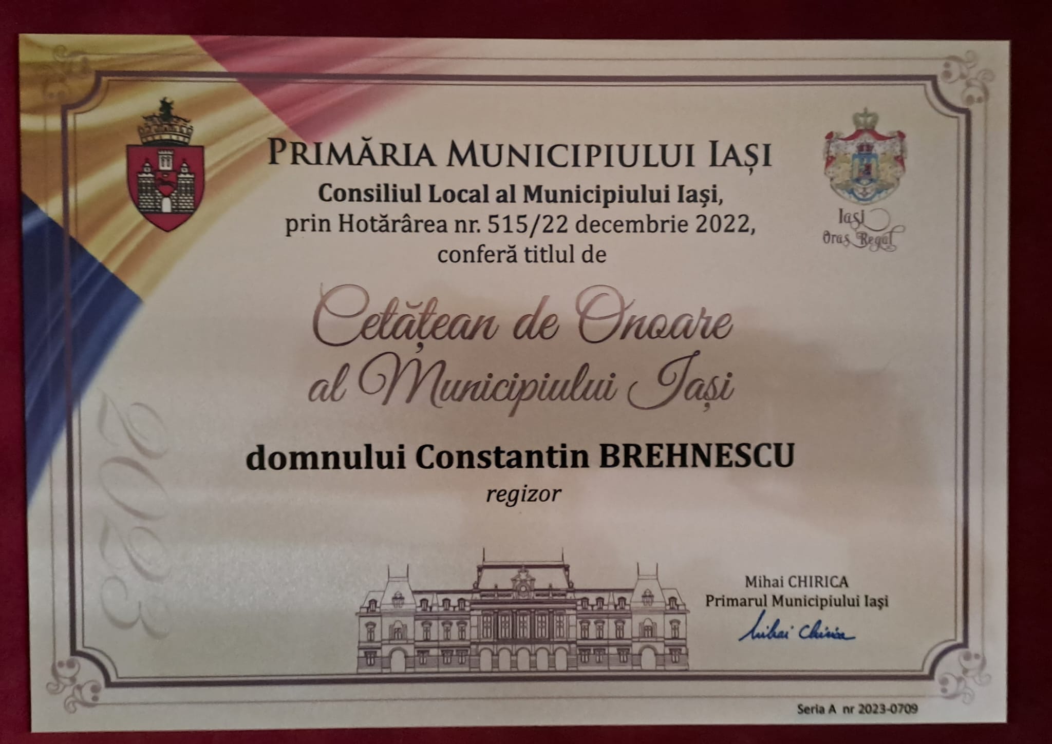 - Cetăţean de Onoare, al Municipiului Iaşi, Hotărârea nr. 515/22 decembrie 2022