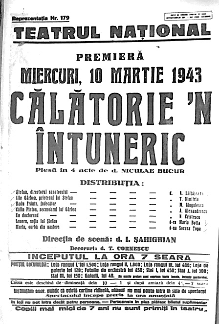 • Manuscrisul piesei Călătorie în întuneric, scrisă în 1930, a fost acceptat la Teatrul Național din București de către directorul Liviu Rebreanu. Piesa, semnată cu pseudonimul Niculae Bucur, a avut premiera pe 10 martie 1943 și a fost pusă în scenă de Ion Șahighian. Piesa, care urmărește căutarea adevărului în propria conștiință, face parte din „Ciclul vieții” al dramaturgiei Soranei Țopa.