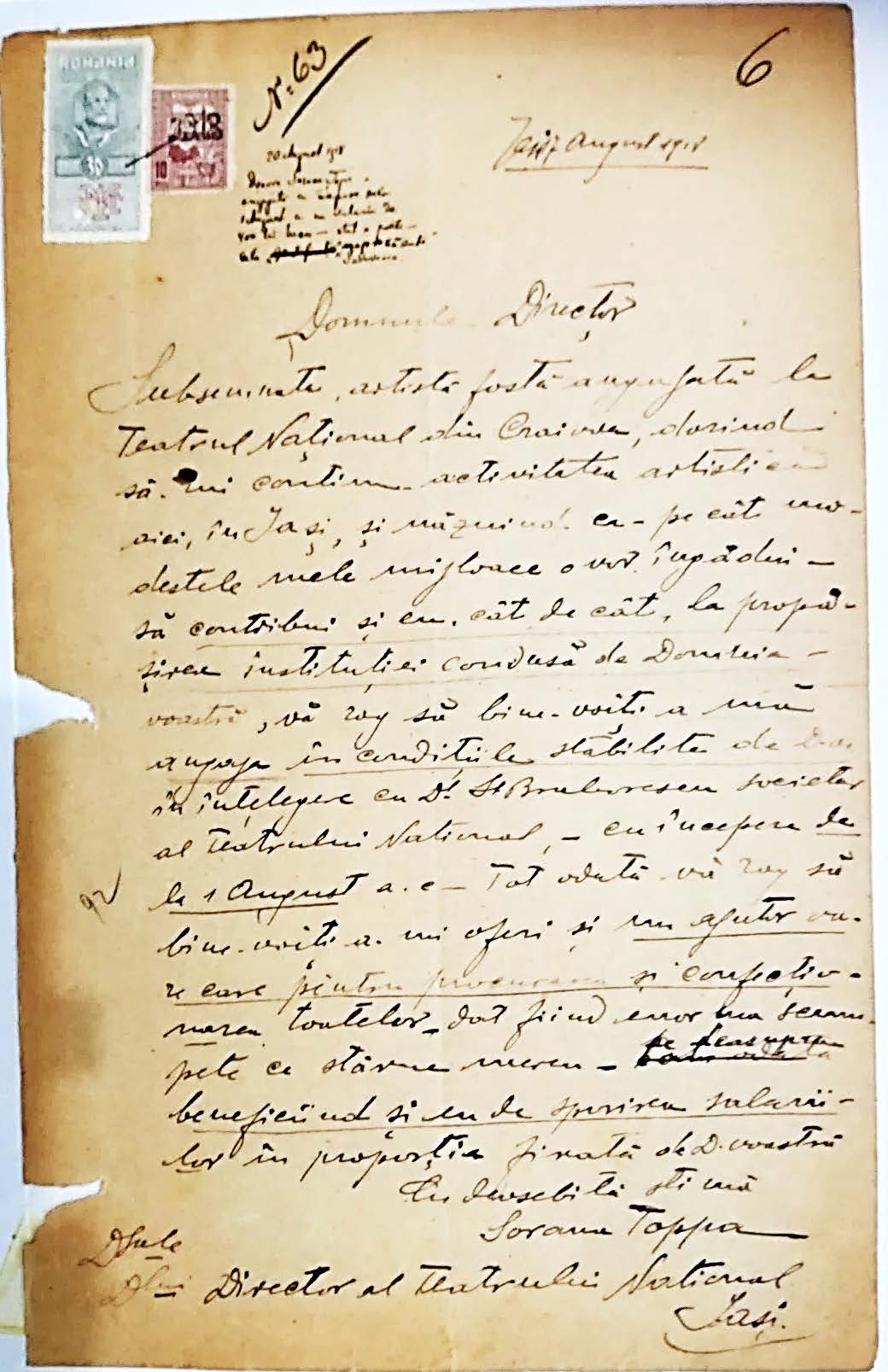 • Mihail Sadoveanu, director al Teatrului Național din Iași, a avut rolul de promotor în cariera Soranei Țopa. El a remarcat-o în comisia de examen a Conservatorului. Sadoveanu a aprobat cererea ei de angajare ca actriță stagiară la Naționalul ieșean în august 1918, oferindu-i astfel o rampă de lansare și șansa de a evolua alături de marii actori ai vremii. De asemenea, Sadoveanu s-a dovedit a fi un sprijin al tinerilor, favorizând o „maximă sudură” între generațiile de actori.