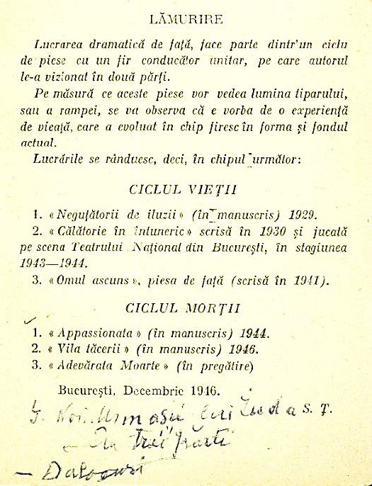 • CICLUL VIEȚII: Neguțătorii de iluzii (manuscris, 1929), Călătorie în întuneric (scrisă 1930, jucată la TNB 1943-1944) și Omul ascuns (scrisă 1941).