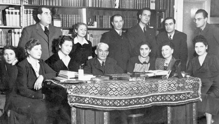 Cenaclul Sburătorul, 1942. De la stânga la dreapta: Sorana Ţopa, Ana Luca, Ion Ojog, Ioana Postelnicu, Lucia Demetrius, E. Lovinescu, Pompiliu Constantinescu, Monica Lovinescu, Vladimir Streinu, Ştefania Zottoviceanu-Rusu, Dan Petraşincu, Maura Prigor, Ion Larian Postolache